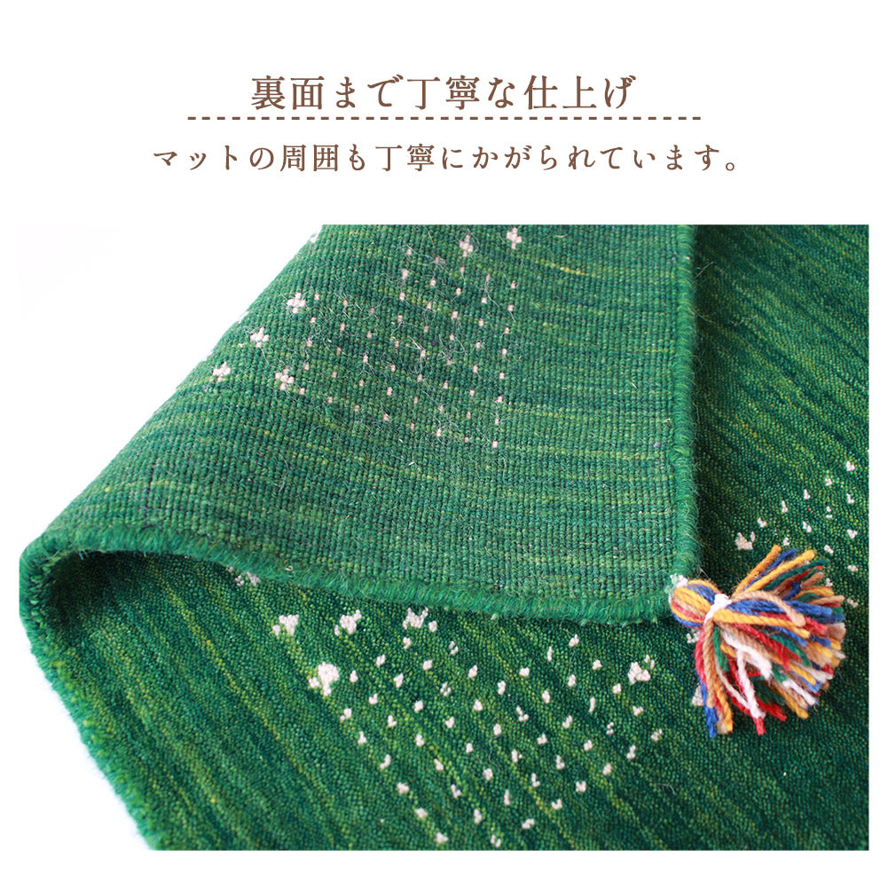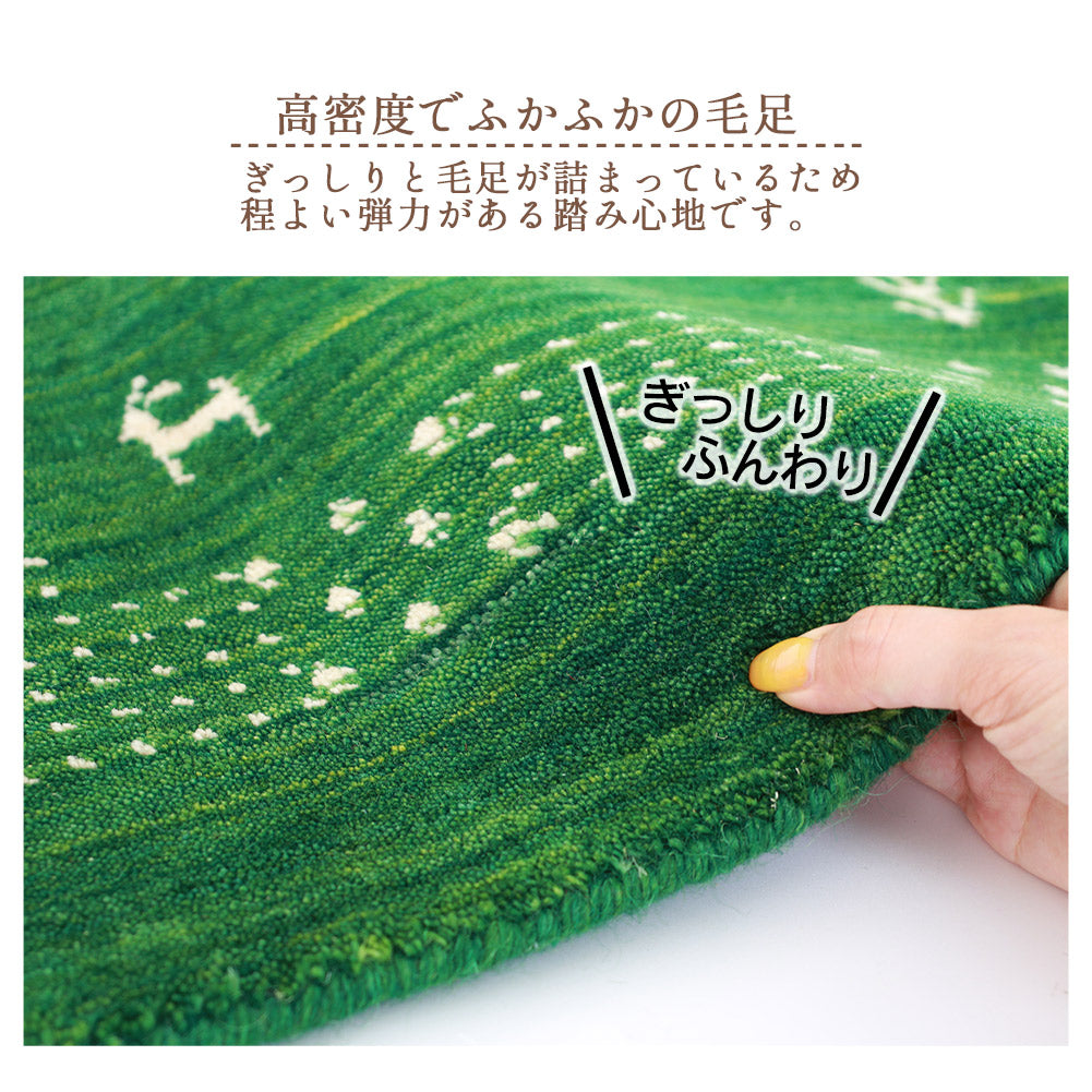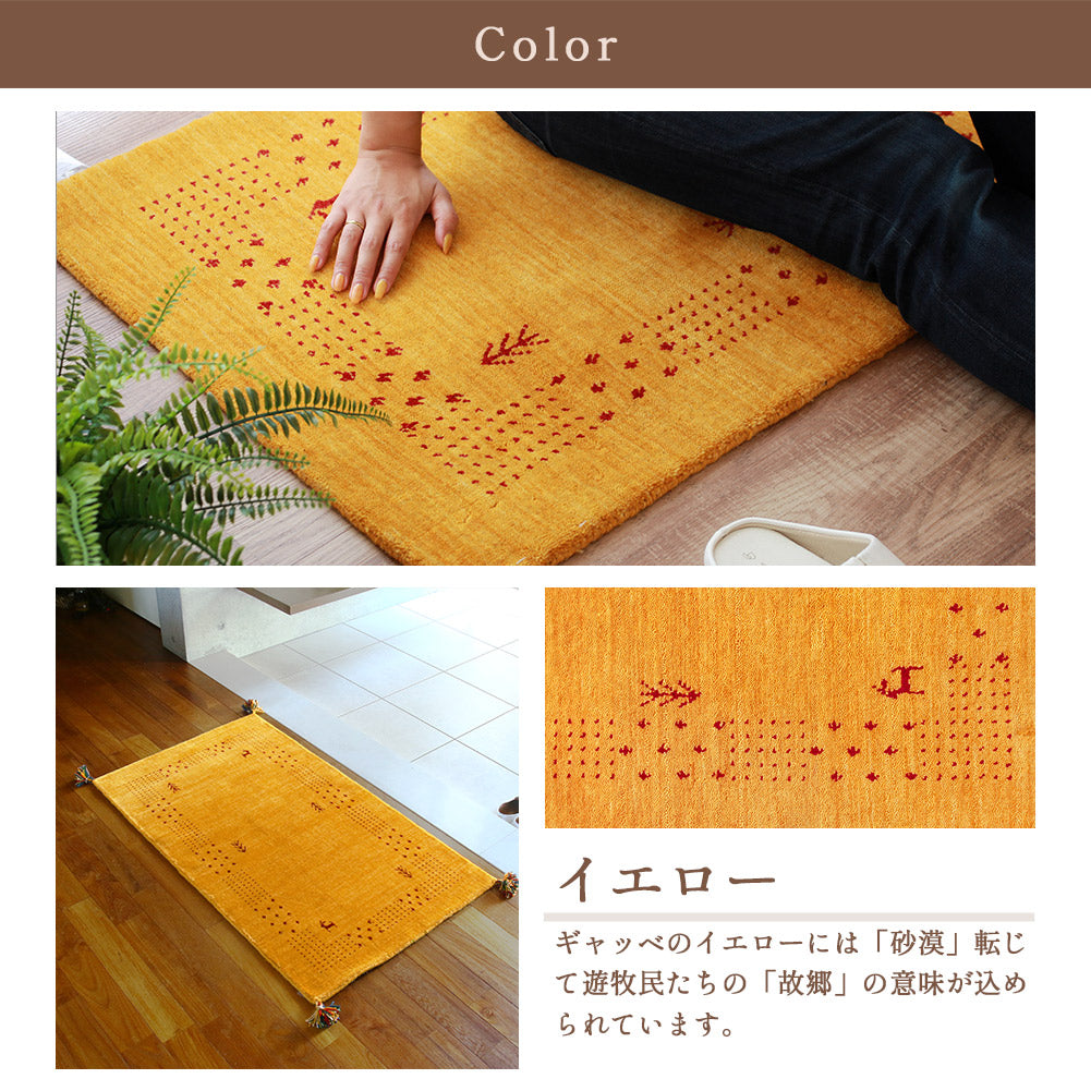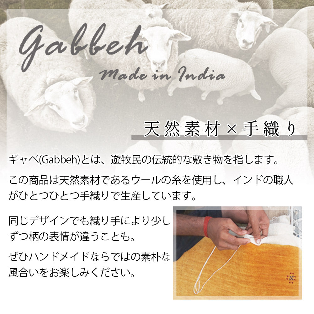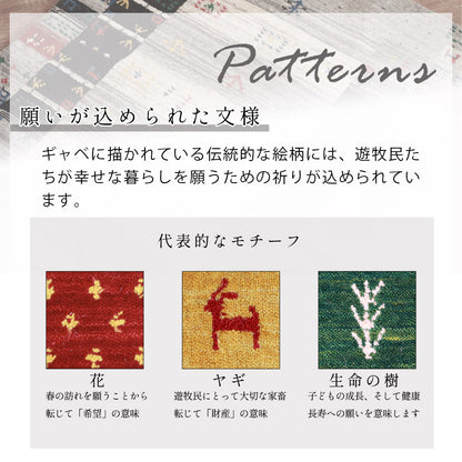 遊牧民族から古くより伝わるウールの絨毯ギャッベ。その独特な文様は一つ一つに様々な意味が込められ、豊かな暮らしを願う人々の思いが織り込まれています。ギャッベに使用される天然ウールは“呼吸する繊維”ともよばれる調湿コントロールに優れた吸湿・放湿効果のある素材で、高い保温性と断熱性で冬に暖かいのはもちろん、湿気を吸収し水分を蒸発することで気化熱が奪われ夏でもサラッとした使い心地。素材そのものの弾力性も強いためへたりにくく、みっちりとした目付けで高密度に織り込むことでより耐久性が高いものに仕上がります。伝統が生んだ天然ウールの絨毯を是非ご家庭でお楽しみください。