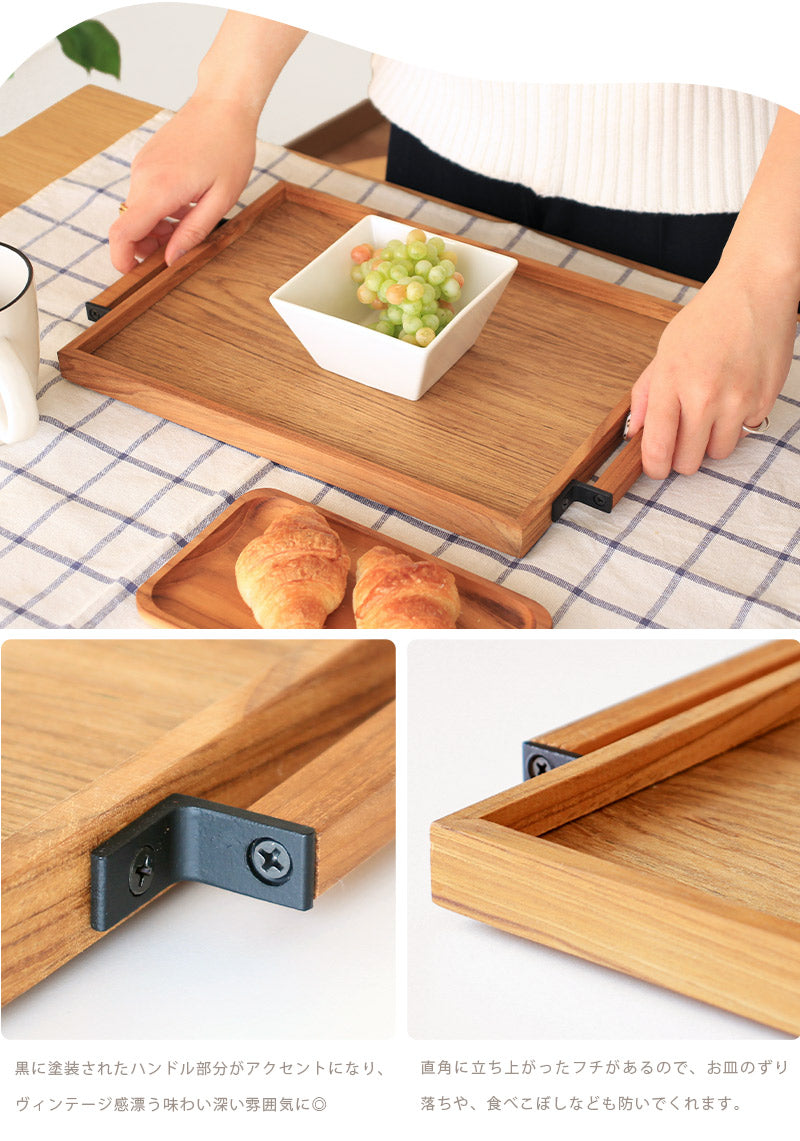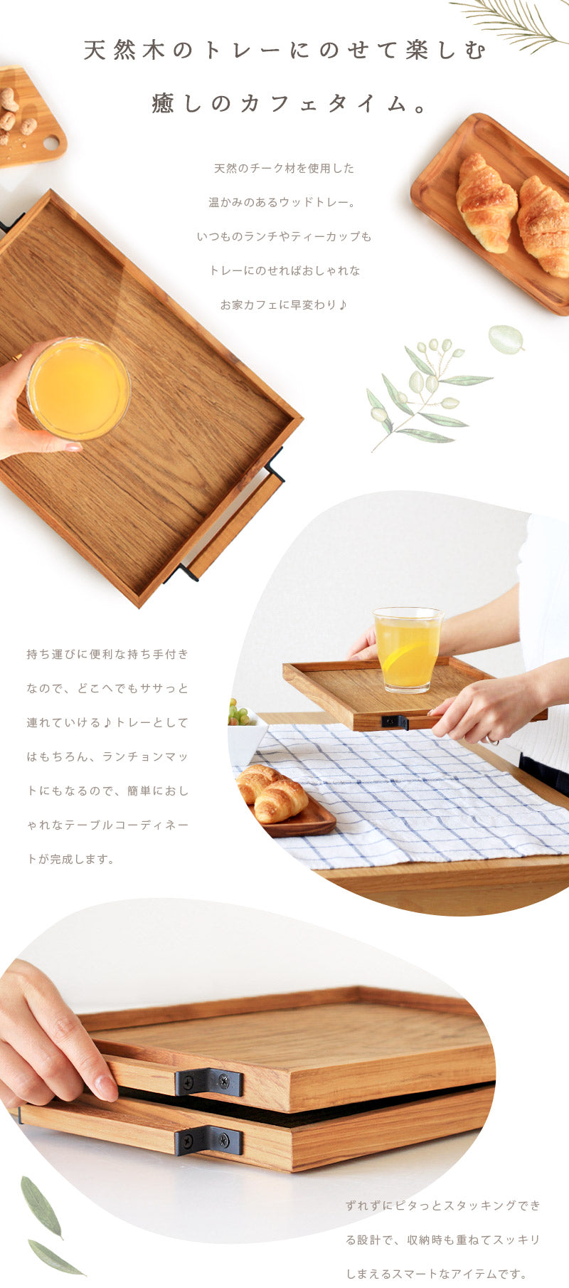 天然のチーク材を使用した温かみのあるウッドトレーが新登場。持ち運びに便利な持ち手付きなので、どこへでもササっと連れていける♪トレーとしてはもちろん、ランチョンマットにもなるので、簡単におしゃれなテーブルコーディネートが完成します。ずれずにピタっとスタッキングできる設計で、収納時も重ねてスッキリしまえるのも嬉しいポイント。いつものランチやティーカップも、トレーにのせればおしゃれなお家カフェに早変わりします♪