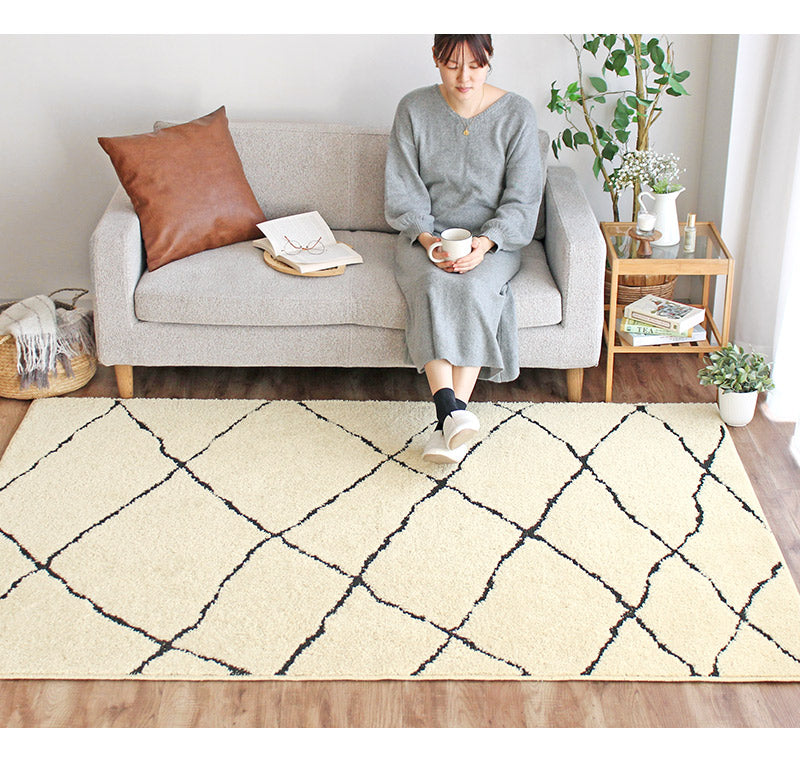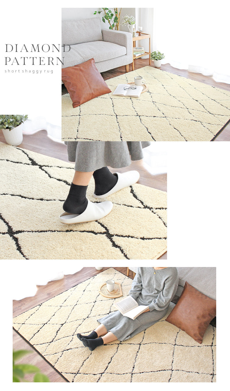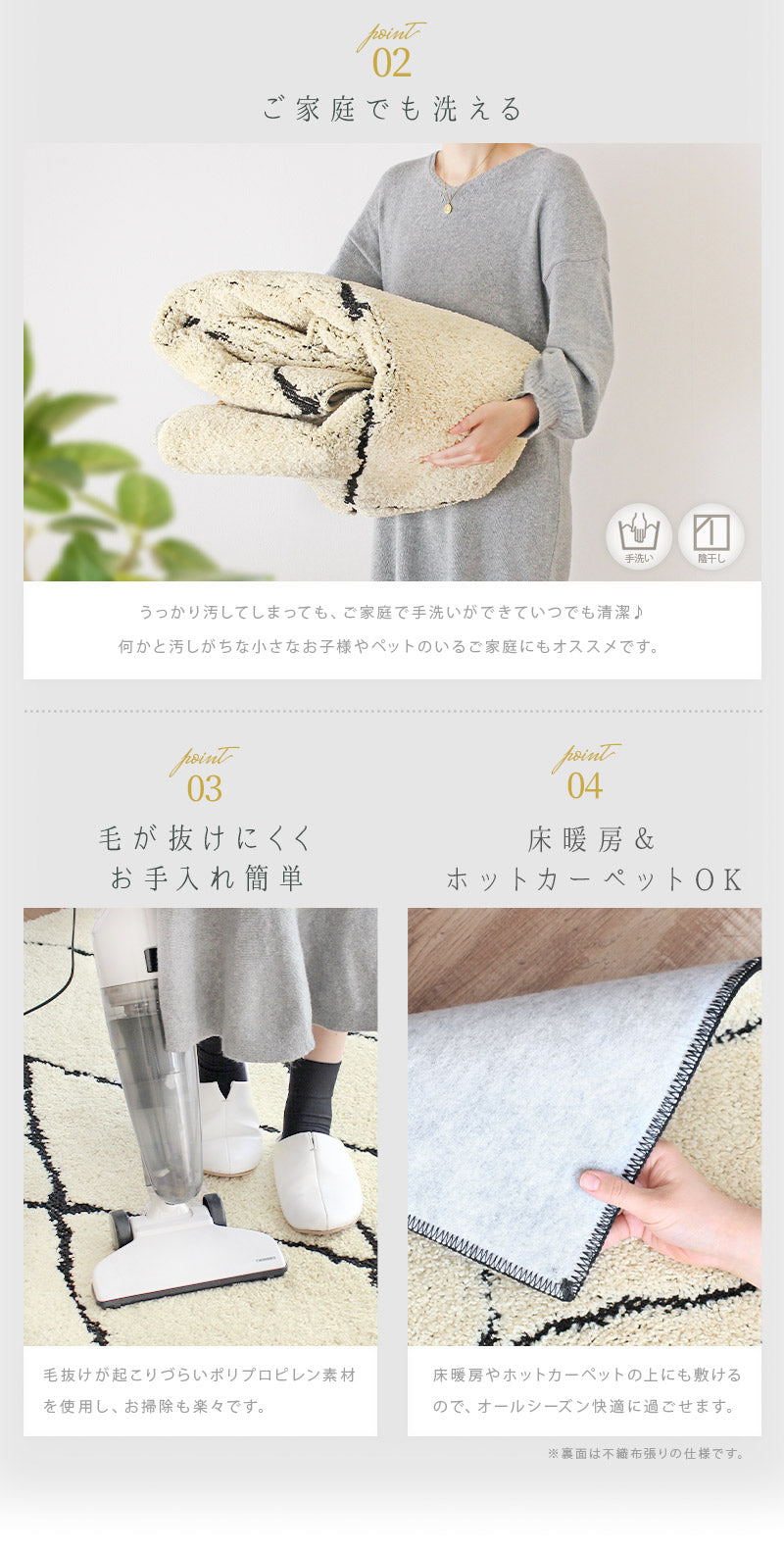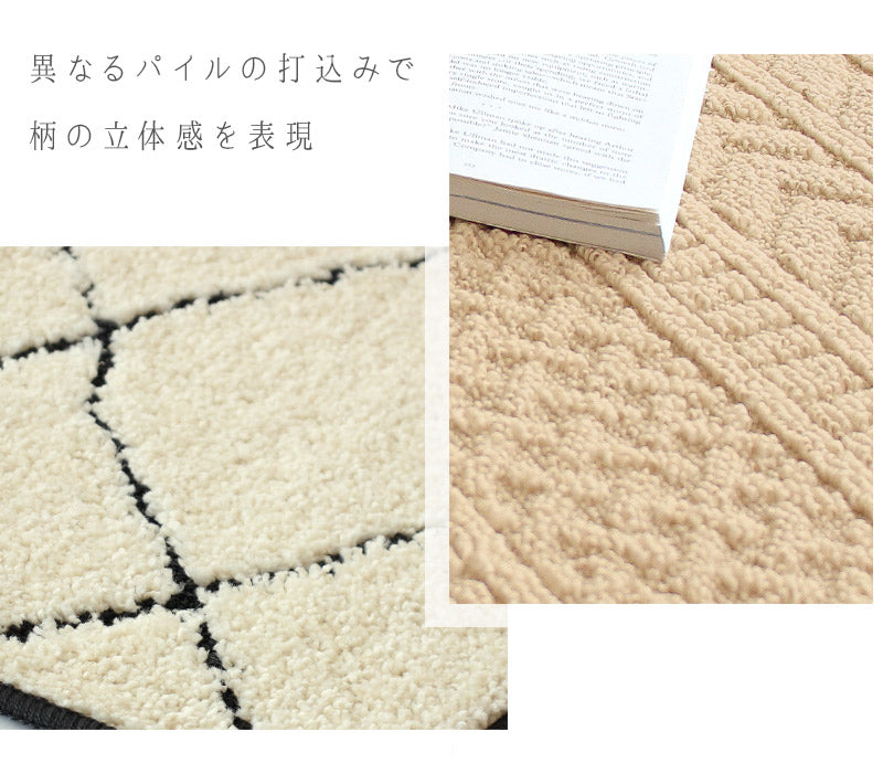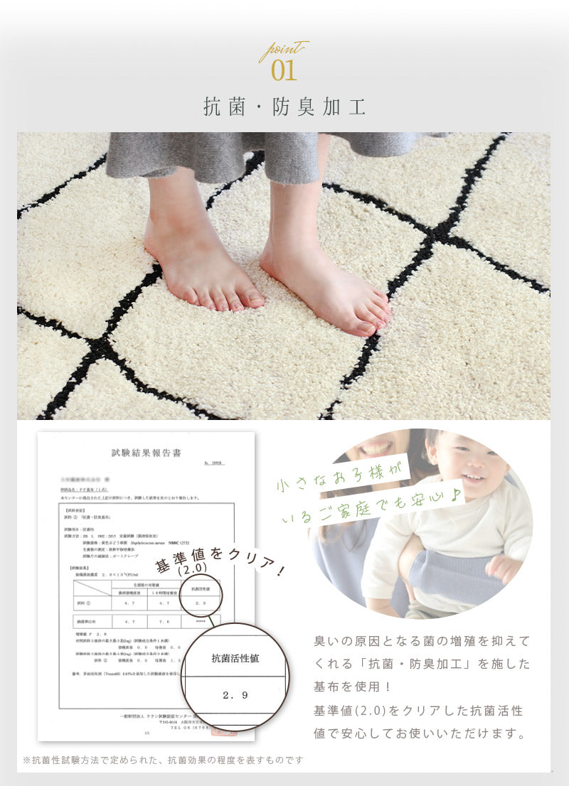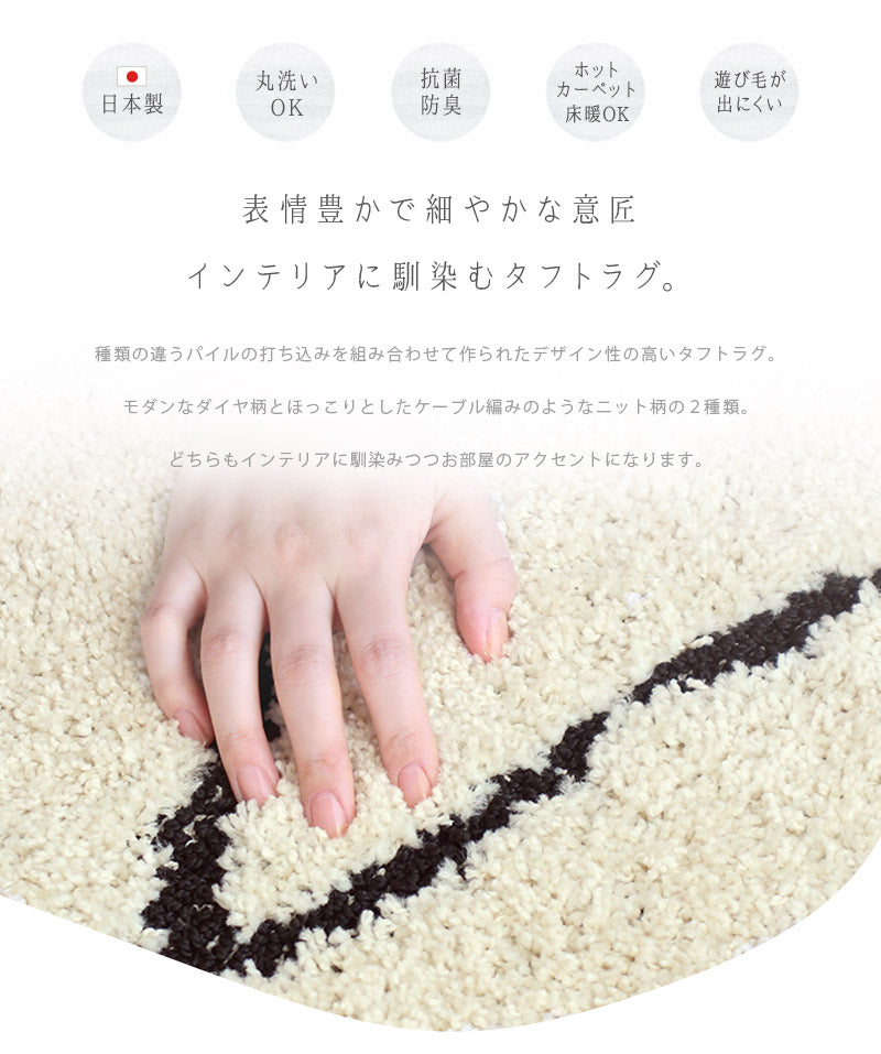 種類の違うパイルの打ち込みを組み合わせて作られたデザイン性の高いタフトラグ。モダンなダイヤ柄とほっこりとしたケーブル編みのようなニット柄の2種類。どちらもインテリアに馴染みつつお部屋のアクセントになります。また手洗いOK&遊び毛の出にくい素材でお手入れもしやすく使い勝手も抜群です。抗菌防臭加工を施し、デリケートなお肌の方でも安心◎メイドインジャパンの繊細な技術が光る美しい織り模様と品質にこだわった一枚です。