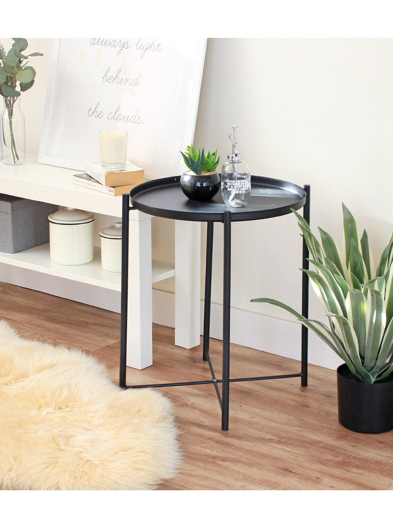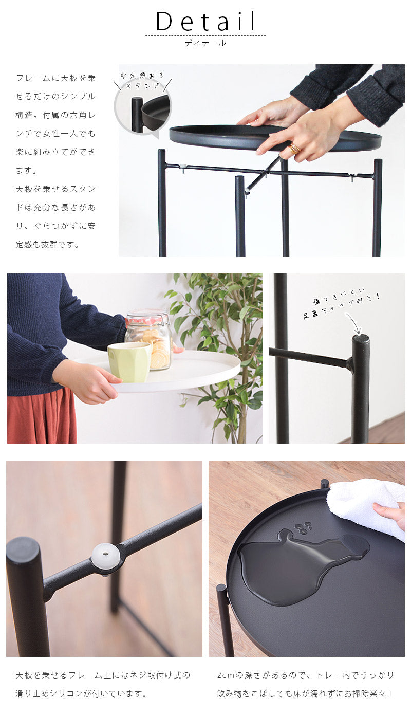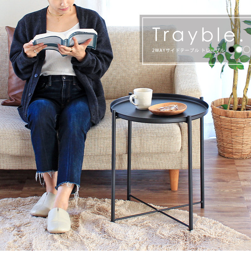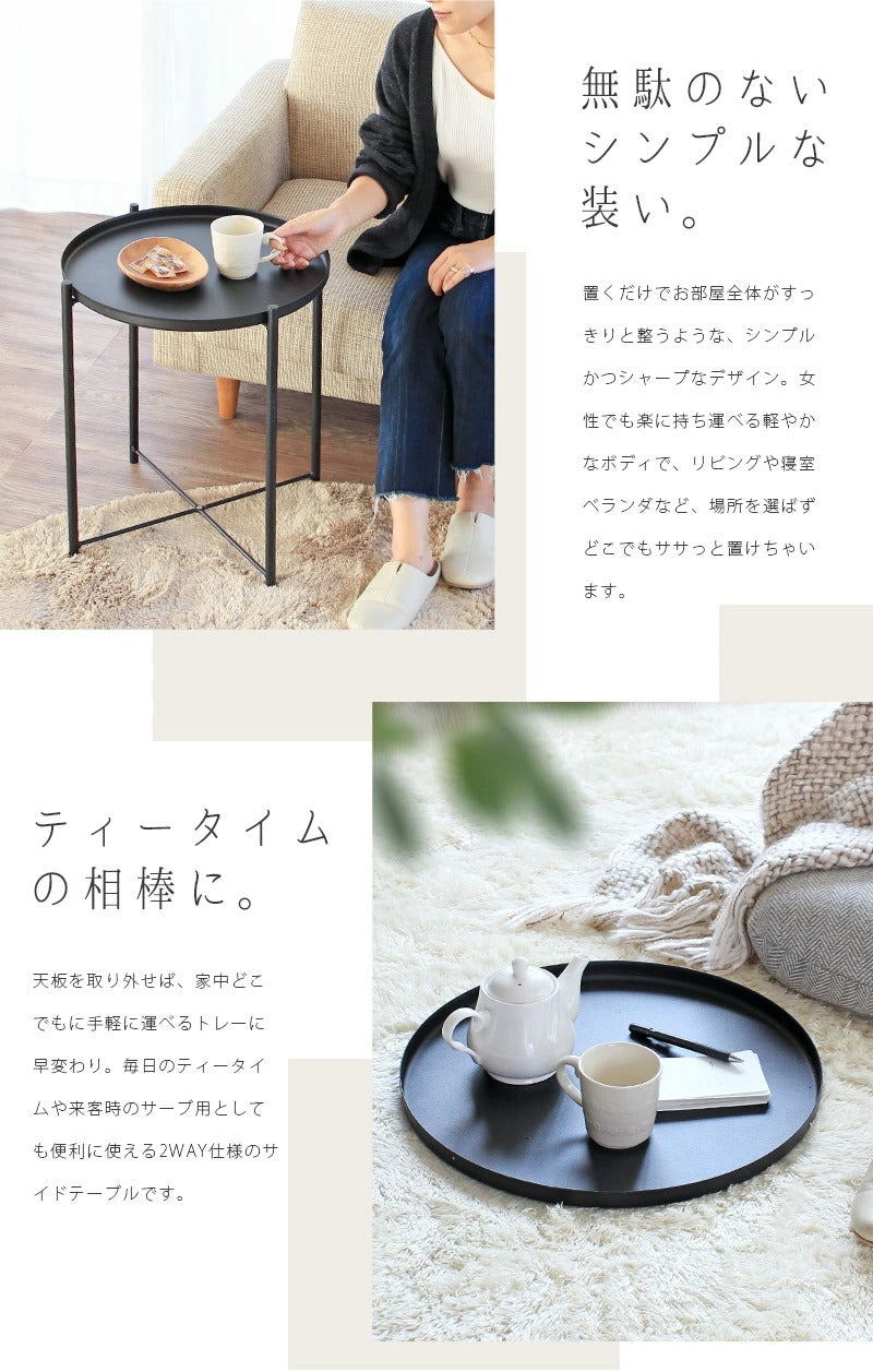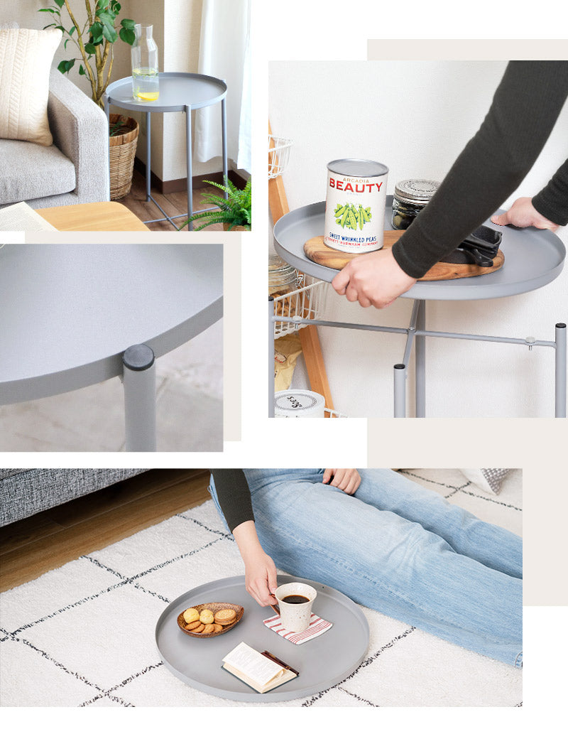 置くだけでお部屋全体がすっきりと整うような、シンプルかつシャープなデザイン。女性でも楽に持ち運べる軽やかなボディで、リビングや寝室ベランダなど、場所を選ばずどこでもササっと置けちゃいます。天板を取り外せば、家中どこでもに手軽に運べるトレーに早変わり!毎日のティータイムや来客時のサーブ用としても便利に使える2WAY仕様です。トレーは2cmの深さがあるので、トレー内でうっかり飲み物をこぼしても床が濡れずにお掃除も楽々♪広々使えるゆったりしたサイズ感で、サイドテーブルとしてはもちろん、観葉植物やコレクションのディスプレイにもうってつけのマルチなテーブルです。