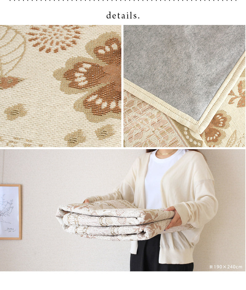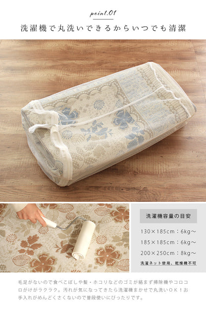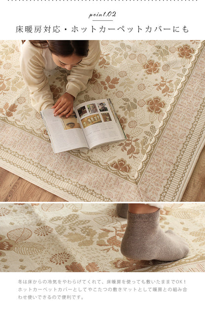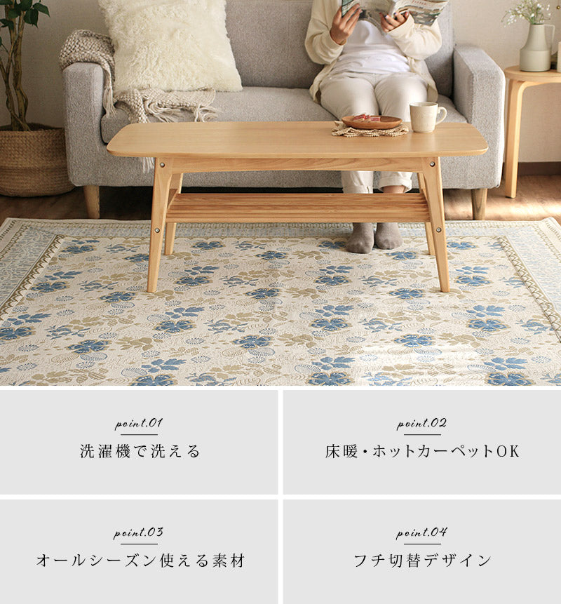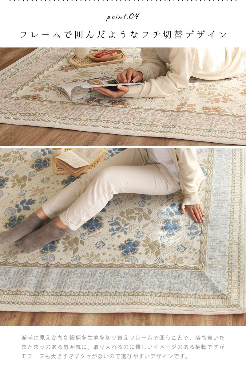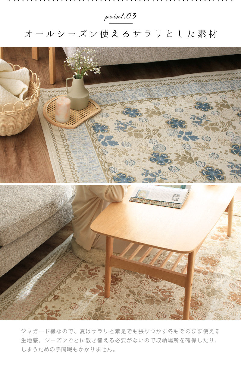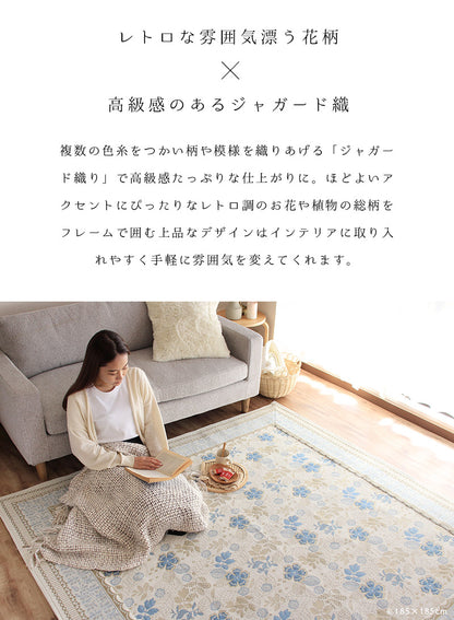 複数の色糸をつかい、柄や模様を織りあげる「ジャガード織り」で高級感たっぷりな仕上がりに。ほどよいアクセントにちょうどいいレトロ調のお花や植物の総柄をフレームで囲む上品なデザインはインテリアに取り入れやすく手軽に雰囲気を変えてくれます。毛足がないジャガード織なので食べこぼしや髪・ホコリなどのゴミが絡まず掃除機やコロコロがけがラクラク。汚れが気になってきたら洗濯機まかせで丸洗いOK!お手入れがめんどくさくないので普段使いにぴったりです。夏はサラリと素足でも張りつかず冬もそのまま使える生地感。シーズンごとに敷き替える必要がないので収納場所を確保したり、しまうための手間暇もかかりません。