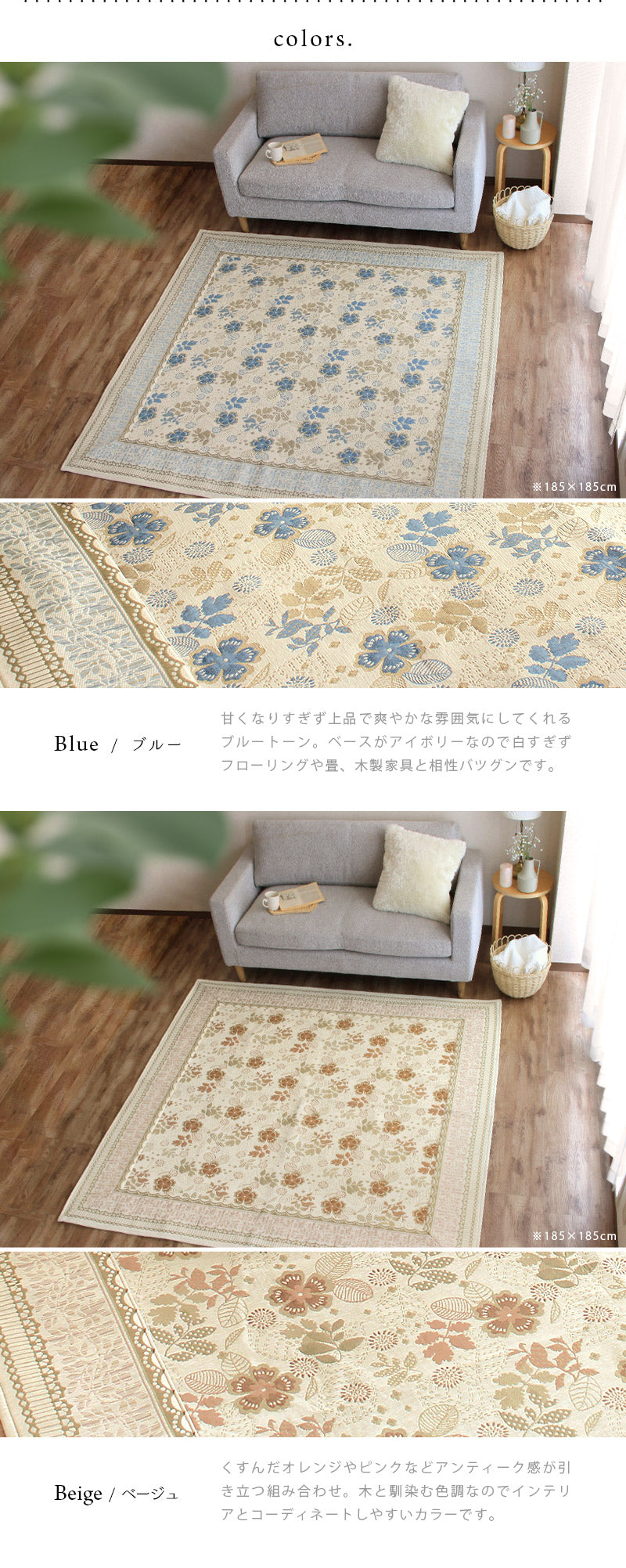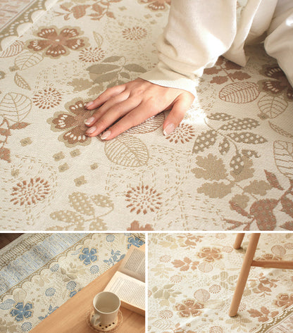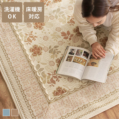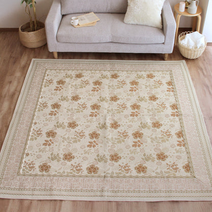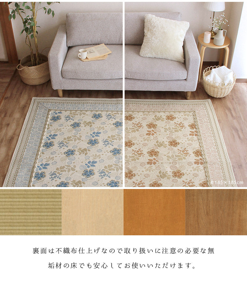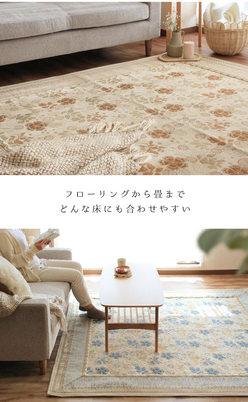複数の色糸をつかい、柄や模様を織りあげる「ジャガード織り」で高級感たっぷりな仕上がりに。ほどよいアクセントにちょうどいいレトロ調のお花や植物の総柄をフレームで囲む上品なデザインはインテリアに取り入れやすく手軽に雰囲気を変えてくれます。毛足がないジャガード織なので食べこぼしや髪・ホコリなどのゴミが絡まず掃除機やコロコロがけがラクラク。汚れが気になってきたら洗濯機まかせで丸洗いOK!お手入れがめんどくさくないので普段使いにぴったりです。夏はサラリと素足でも張りつかず冬もそのまま使える生地感。シーズンごとに敷き替える必要がないので収納場所を確保したり、しまうための手間暇もかかりません。