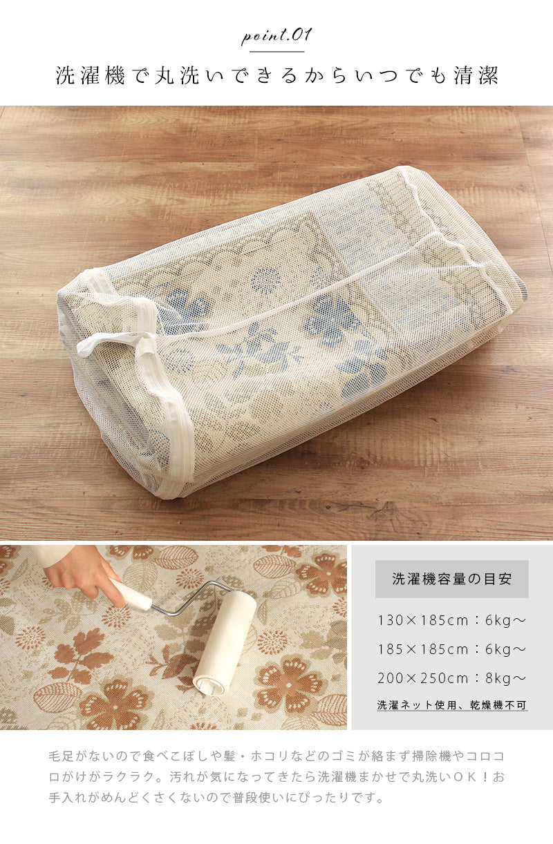 | お手入れ方法 | ●洗濯機OK ●洗濯の際は洗濯ネットを使用してください。 ●洗濯機では裏面の風合い変化、若干の縮み、型崩れが発生しますが使用には問題ありません。 【洗濯容量目安】~2畳まで:6kg、3畳まで:8kg ※ドラム式洗濯機では洗えません。 ※洗濯機の形状により入らない場合は手洗いしてください。 ●ドライクリーニング不可。 |