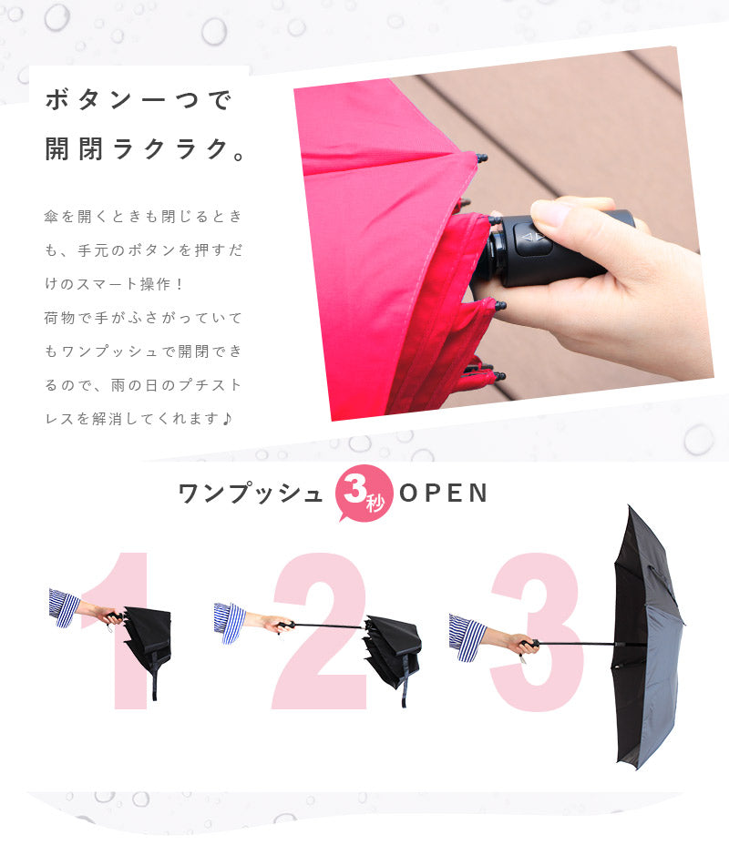 片手で瞬時に開閉できる自動開閉式を採用し、傘を開くときも閉じるときも手元のボタンを押すだけのスマート操作で雨の日のプチストレスを解消♪