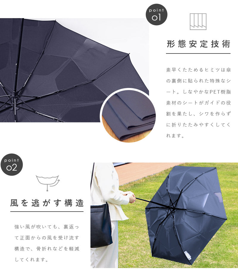 傘の裏側に貼られた特殊なシートがガイドの役割を果たし、急いでいるときでもシワを作らずに折りたたみやすくしてくれます。