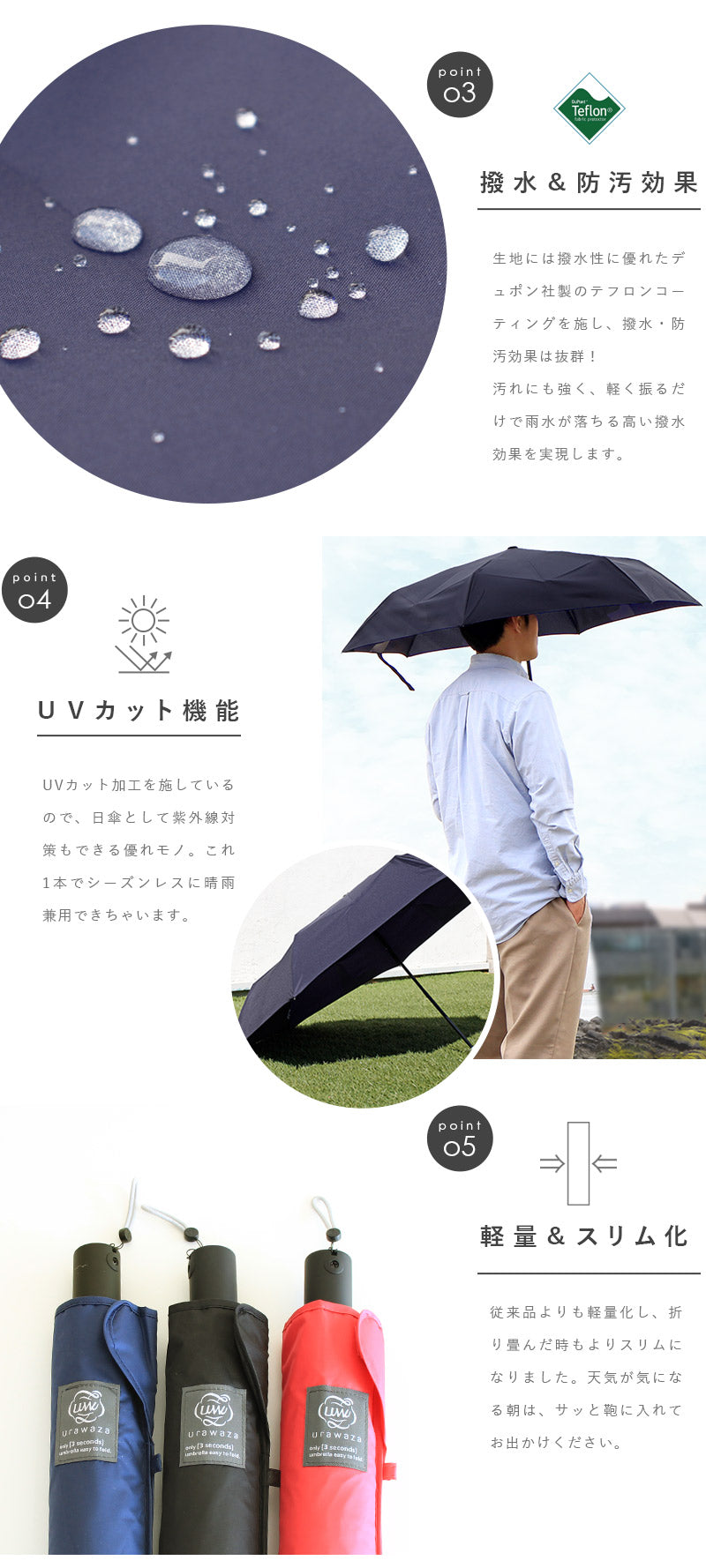 urawaza slim 3秒で折りたためる自動開閉傘 晴雨兼用