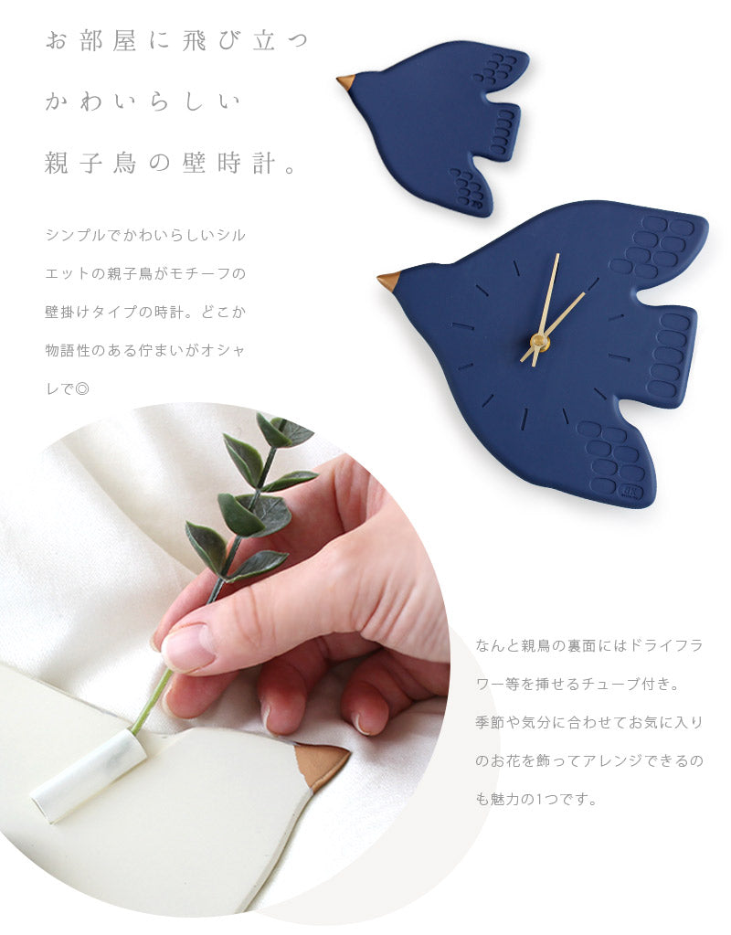 シンプルでかわいらしいシルエットの親子鳥がモチーフの壁掛けタイプの時計。どこか物語性のある佇まいがオシャレで空間のアクセントになります◎なんと親鳥の裏面にはドライフラワー等を挿せるチューブ付き。季節や気分に合わせてお気に入りのお花を飾ってアレンジできるのも魅力の1つです。ブランドロゴつきのシンプルな専用パッケージでお届けするので、ご自宅用にはもちろん、大切な人へ贈るちょっとしたギフトにも喜ばれます。
