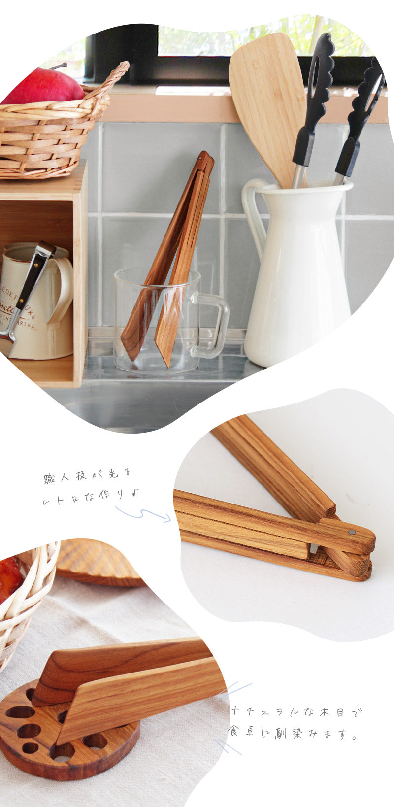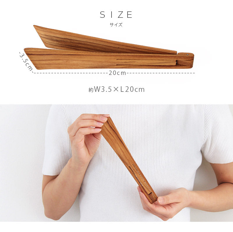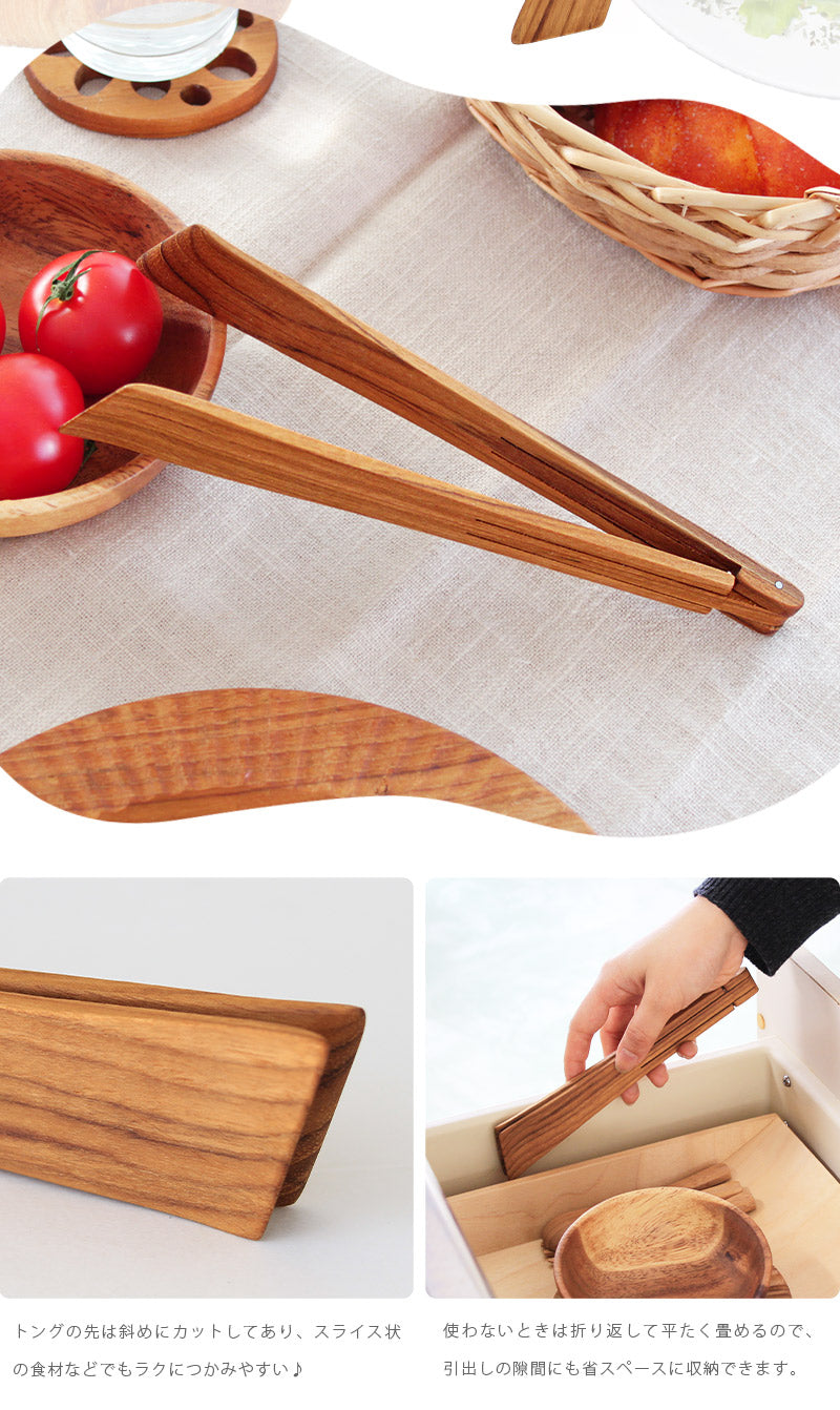天然チークのナチュラルな木目にほっと癒される木製トング。金属製のものに比べあたりが柔らかいので器を傷つけにくく、テーブルに添えるだけでこなれ感を演出してくれます。2枚のパーツの接合部を軸にクルッとひっくり返すと、切り込み部分がバネの替わりになりトングが開閉できる仕組みで、トラッドなアイデアの詰まった逸品です。サラダやパンなど、毎日の食事にはもちろん、ホームパーティで出す大皿料理の取り分けにもオススメ♪飾り気のない素朴なテイストなので、どんなお料理にもしっくり馴染みます。