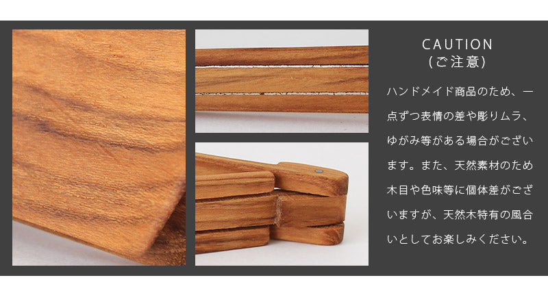 | 備考 | ●木の乾燥を防ぐため表面にオイルコーティングを施しており、布や紙などの沁み込みやすいものと長時間触れているとオイルがにじむことがございますのでご注意ください。 ●直射日光にあたる場所や熱、火は避けてください。 ●こちらの商品は天然木のため、ふしや歪みが出たり模様や色合いサイズなどひとつずつ個体差が生じます。予めご了承ください。 |